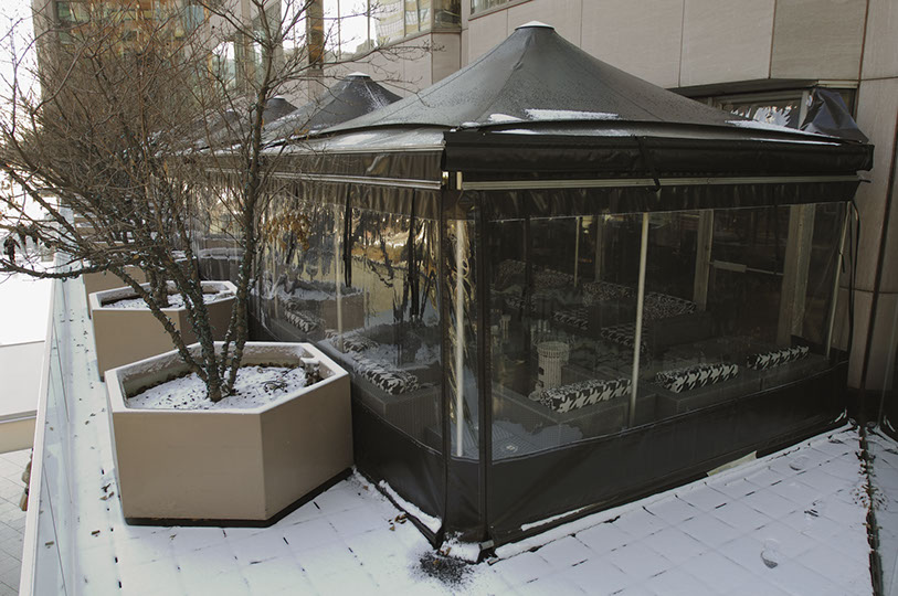 Fabricated nine umbrella enclosures for outdoor seating with clear roll glass and black Ferrari stamoid at Mortons restaurant in Washington DC